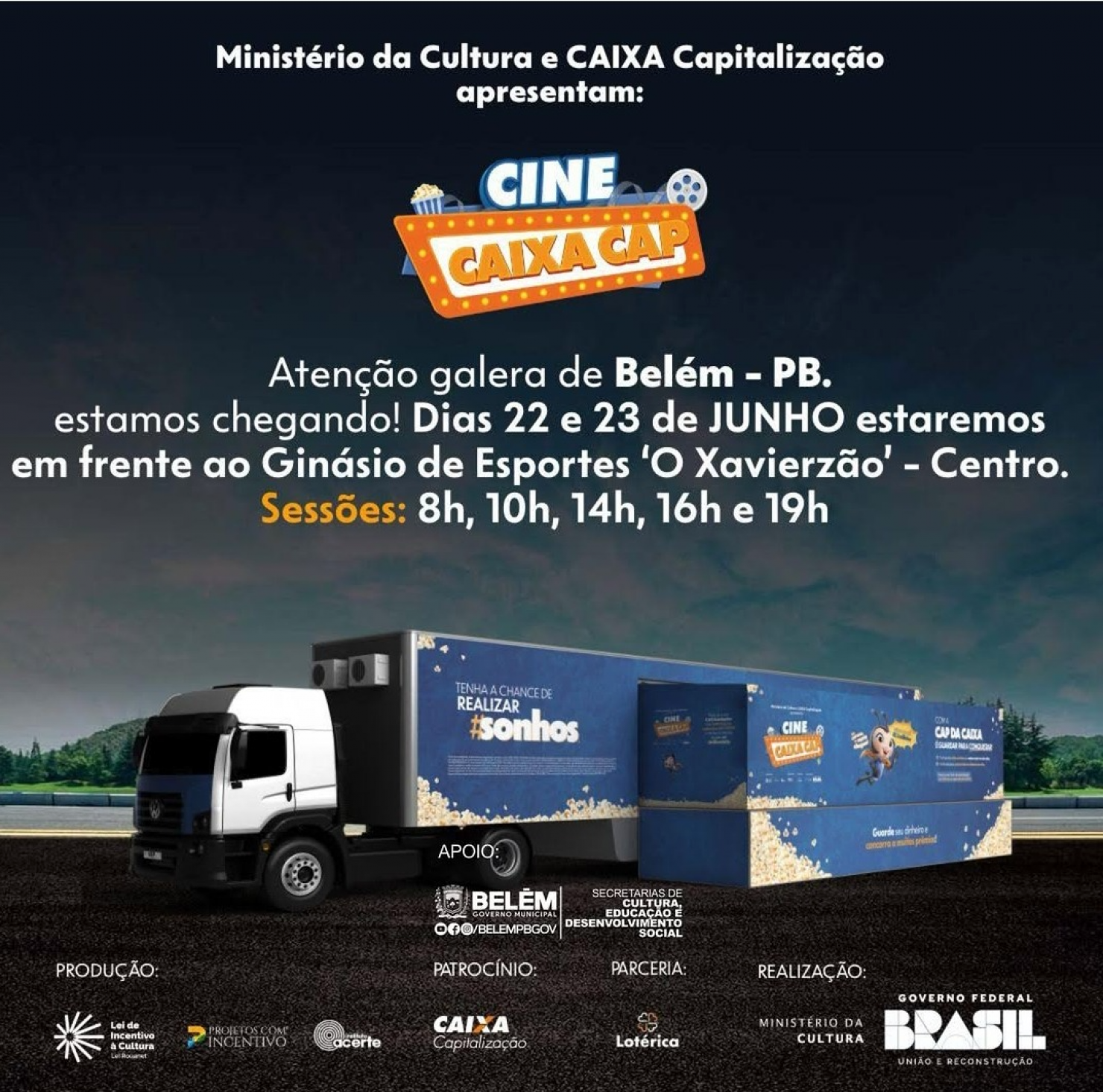 Durante os dias 22 e 23 de Junho a sala de cinema INTINERANTE estará estacionada no calçadão do Ginásio "O Xavierzão" com sessões gratuitas durante os dois dias.
