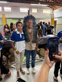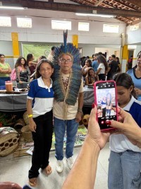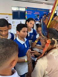 Durante todo o momento de interação os alunos puderam conversar sobre o dia dia da aldeia, tirar dúvidas e receberam uma aula da professora indígena Rita Jaciara sobre a invasão holandesa na Baía da Traição.