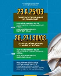 O calendário terá dias específicos de cadastramentos sendo o período de 23 a 25 de março reservado para as famílias beneficiárias do programa "Sopa e Pão" do governo municipal, e o período de 26,27 e 30 de março destinado para as famílias de baixa renda, inscritas no Cadúnico. Os locais de cadastramento serão na Secretaria de Desenviolvimento Social, em Belém na rua Flávio Ribeiro Coutinho (prox. à prefeitura), e em Ruva Nova no prédio do CRAS localizado na rua Jorge Rodrigues.