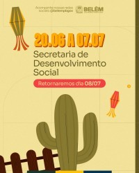 Já a Secretaria de Desenvolvimento Social terá um recesso coletivo iniciando em 20 de junho e retornando em 07 de são João