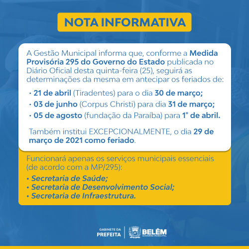 A gestão municipal informa que, conforme a medida provisória 295 do governo do estado publicada no diário oficial desta quinta-feira (25), seguirá as determinações da mesma em antecipar os feriados de: 21 de abril (Tiradentes) para o dia 30 de março, 03 de junho (Corpus Christi) para dia 31 de março, e o de 05 de agosto (fundação da Paraíba) para 1° de abril, e institui excepcionalmente, o dia 29 de março de 2021 como feriado.