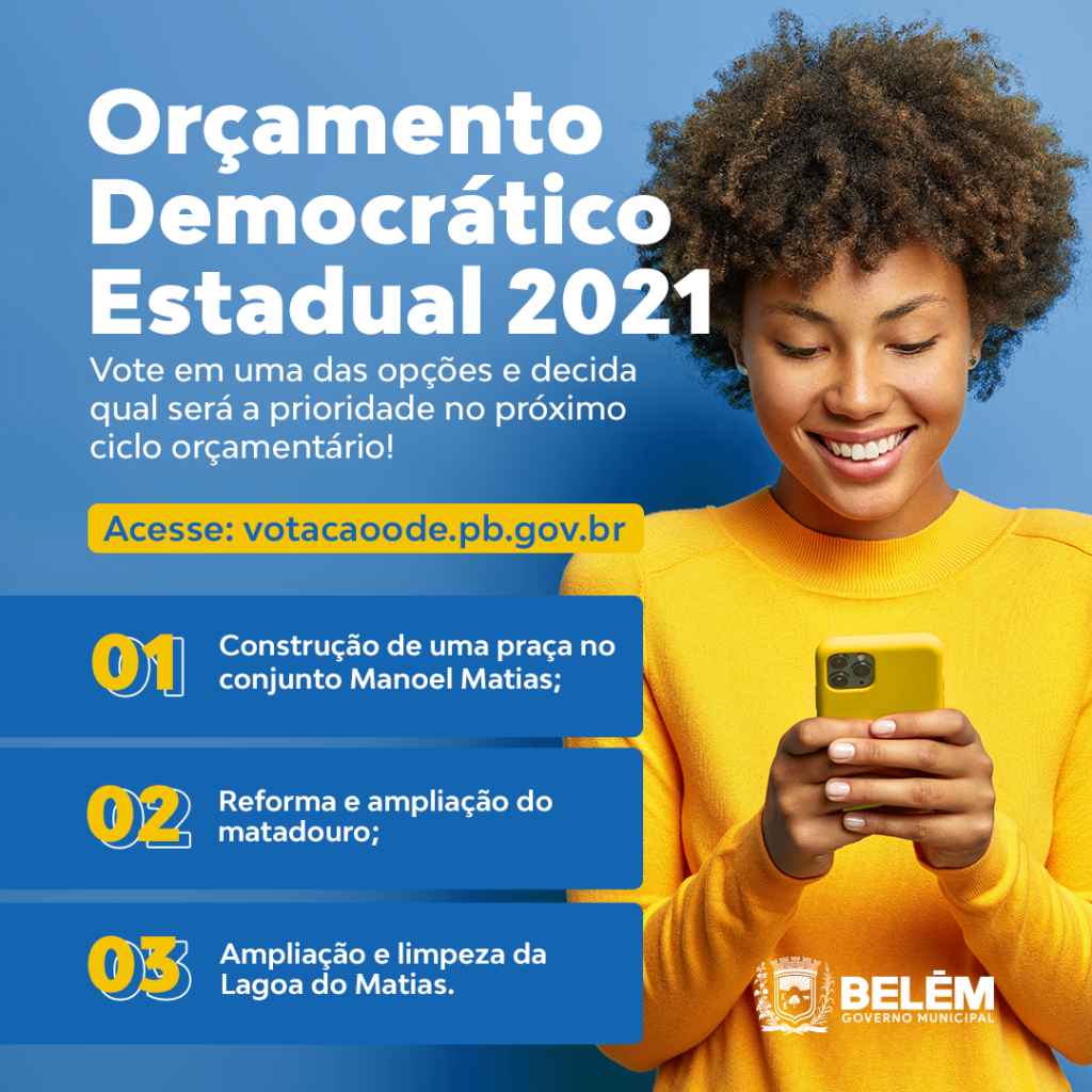 O orçamento democrático 2021 já está acontecendo de forma online e todos nós podemos participar e opinar até 3 vezes. A prefeitura Municipal de BELÉM está mobilizando toda nossa população para participar, e elencou algumas sugestões importantes que podem ser opinadas quando estiver votando. As sugestões são: Construção de uma praça no conjunto Manoel Matias, Reforma e ampliação do matadouro público e Ampliação e limpeza da barragem Lagoa do Matias.