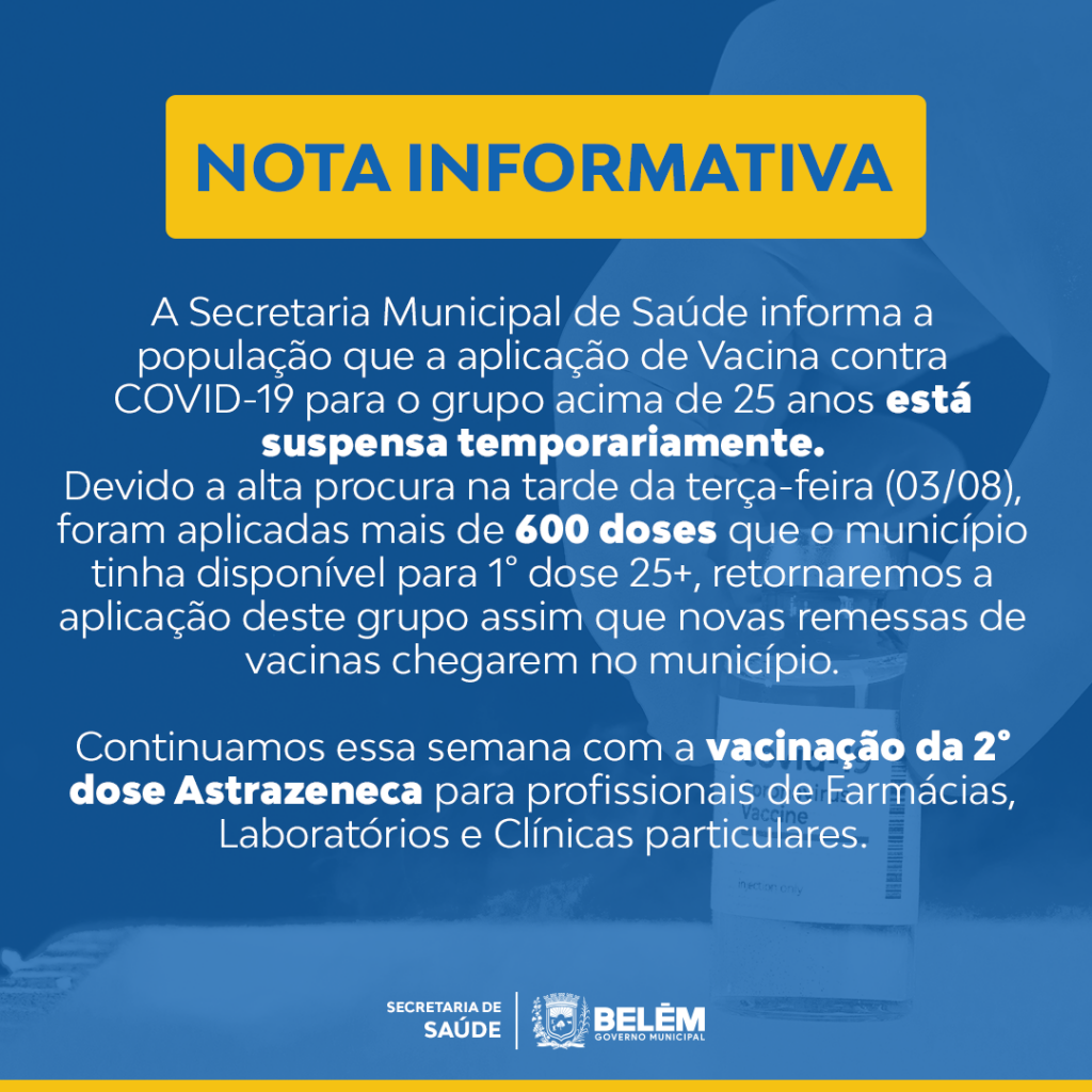 A Secretaria Municipal de Saúde, divulgou nesta quarta – feira (04/08) que está temporariamente suspensa a vacinação contra covid do grupo de pessoas sem comorbidades com idade acima de 25 anos.