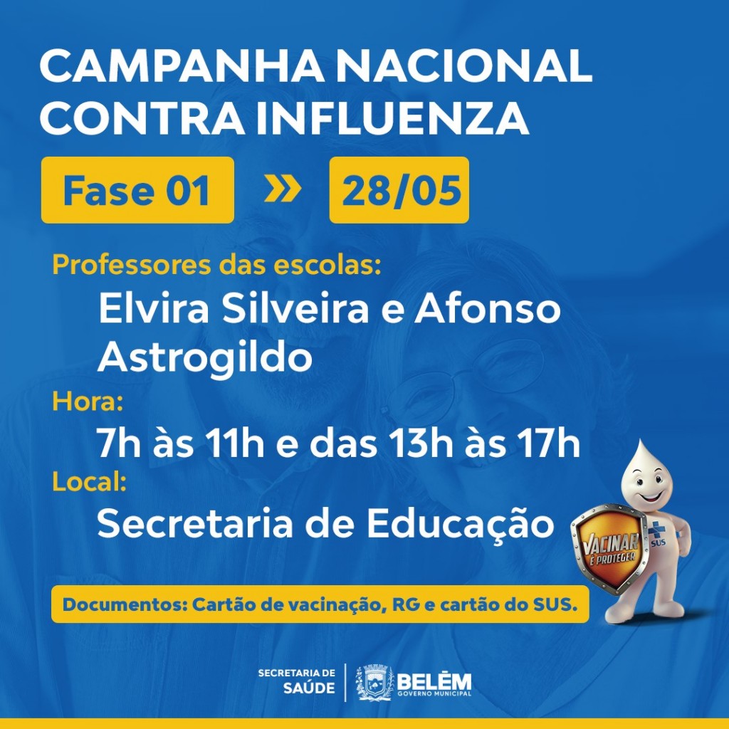 A campanha de vacinação contra o vírus influenza continua em nosso município e durante os dias 27 e 28 de maio estará iniciada a vacinação para os professores da rede pública na sede da Secretaria Municipal de Educação.